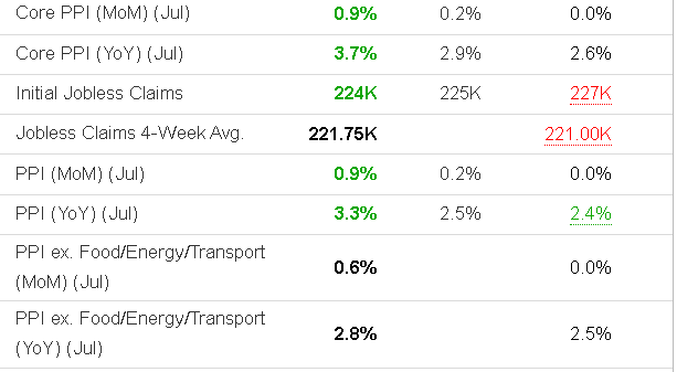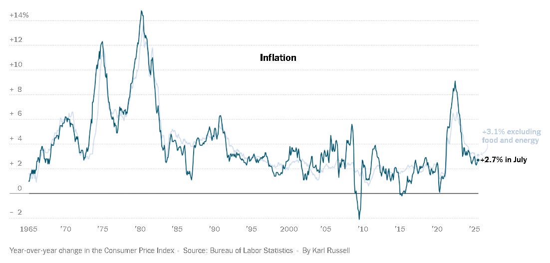 The green shoots of the inflation seedlings, planted on Liberation day, are staring to sprout. Core CPI (excluding food & energy) rising at the fastest annual pace in 5 months- see below. The market however DOES NOT CARE. Tariffs and resulting inflation is NOT a concern to speculators. CPI & PPI run hot, buy the dip. Powell to get sued by Trump-moderate dip-buy it. Tariffs up to 100% on pharma-buy more. I’m trying to learn as much as possible from some great mentors who have been in the markets for up to 40 years, and they all come back to the same sanguine spot- It’s going up! Stay with it or don’t short it- nothing more. You can talk all you want about this and that, at the end of the day, ‘don’t fight the tape’ is all you need to know.