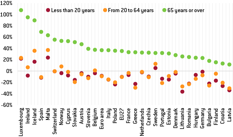 This has caused a number of governments to look at mandatory pension schemes in in order to protect its citizens against inflation but also to ease the burden on sovereign finances as global populations everywhere are aging. If we study this chart from Bruegel, we can see that by 2050, in Luxembourg the 65yrs+ cohort will grow 110%, while in Greece the 20 to 64 cohort will drop by 20%. For the EU27, the 65+ cohort will increase 40% while 20-64yrs cohort will decrease by about 10%. The problems in the ‘developed world’ are stark. An aging population and not enough finance to cover the states social responsibilities. We need a new baby boom! Luky for the world, there is Sub Saharan Africa