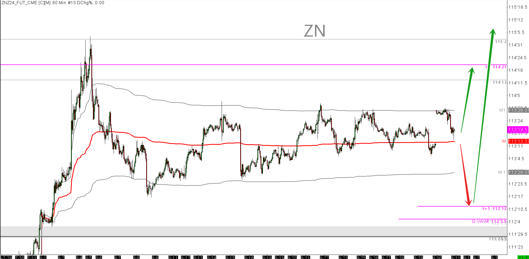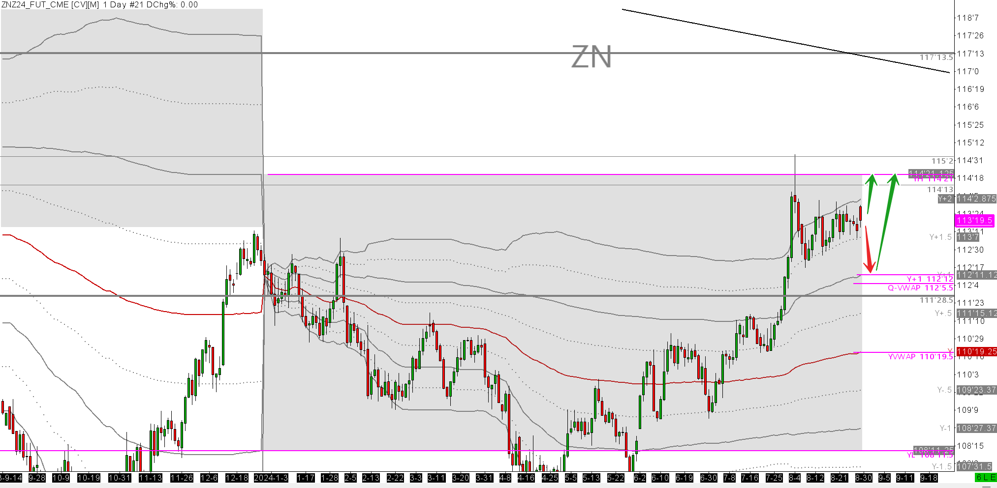 If I'm taking trades in gold, I want to be able to see if ZN is leading it at all. If I see the two in dissonance, I will stay clear of Gold. If I see both say imbalance up or down, I will look to execute at my edge defined areas. While I see that ZN has some more business to do on the upside to hit the swing target of Y-PVAH $114,21s, I see that it may want to load up the buying boat back down at Y+1 or more likely Q-VWAP. This is why I like the shorts in gold. Then, when we get down there on ZN, I can look for a turn both on ZN and Gold if the acceptance is holding positive.