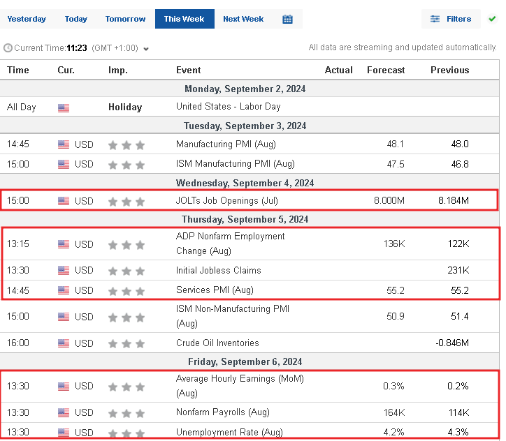This weeks highlights. Monday market holiday for Labour Day, Wednesdays JOLTs job openings, Thursdays ADP and initial jobless claims. Fridays NFP and unemployment figures out of the US.