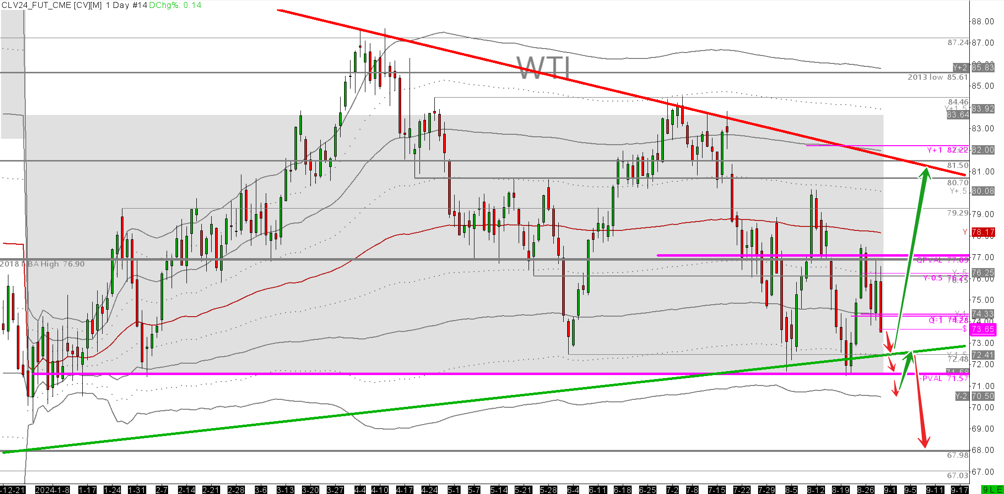 It is wild out here in energy. Between rallies on Hezbollah attacks in Northern israel, then in the same 24hrs, full production shut down of oil in Libya. Price rallied pretty hard Friday 23rd and Monday 26th of the week. From $73s to $77s. We went too far too fast. Libya production is not 100% gone. July production was 1.18million bpd, as of Thursday it is down to 700,000bpd. This may go lower. Please read here and here for a deeper understanding. But regards Libya, there is no improvement in sight at all for now.