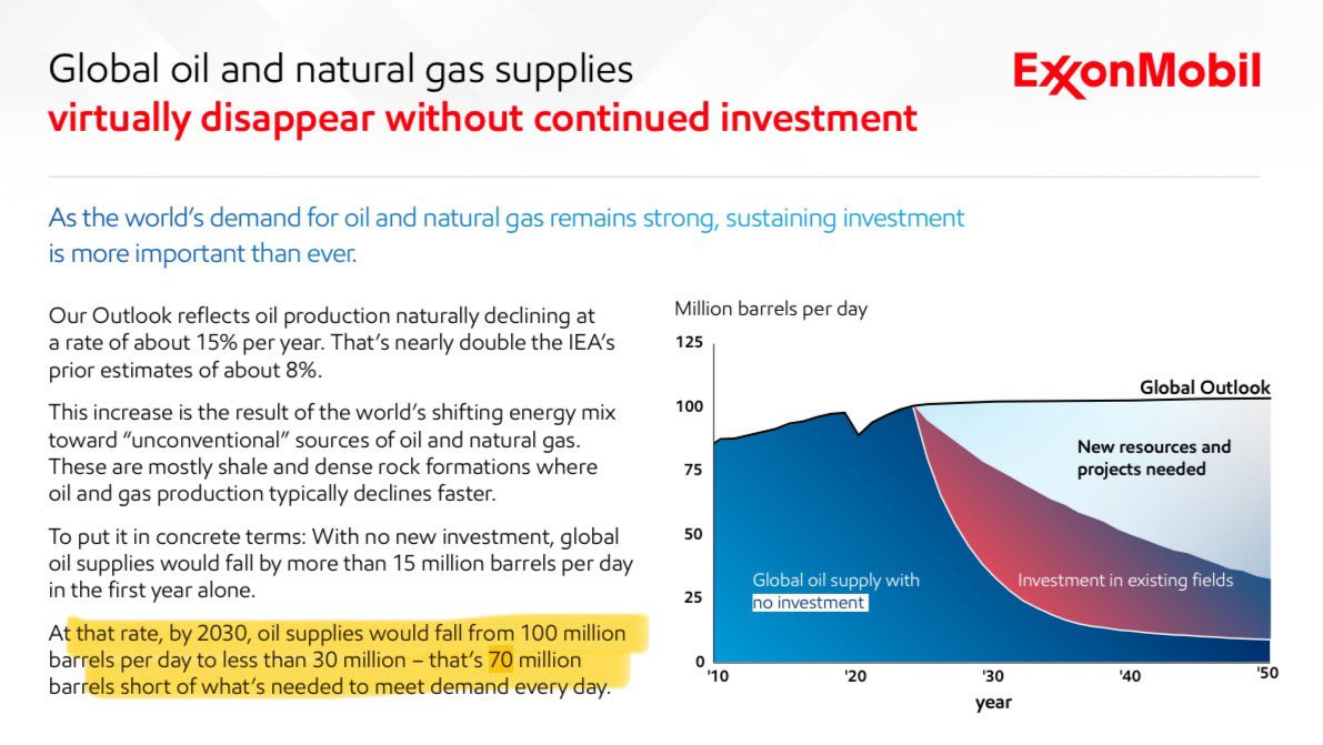 If you trade oil and are not against reading a report, then please read this Exxon Mobil report on global outlook to 2050- a compelling read and one that endorses what I have said for the last 3 years. The carbon free future translates to $200,$300,$500 a barrel of oil prices. Not lower and zero. Why? Well as demand starts to diminish over the coming years, the reinvestment picture for oil will get slashed drastically. With lower investment, you get lower production. So if you have a market where demand drops off slower than investment in production, you have a demand deficit. We will still need approx 100mbpd of oil in 2050, yet the reinvestment to 2050 will only be producing roughly 30mbpd. Meaning that oil will have a market supply deficit of 70mbpd. Strong stuff. This is why I remain long energy assets PBR 0.00%↑ PAA 0.00%↑ are some of my biggest holdings.