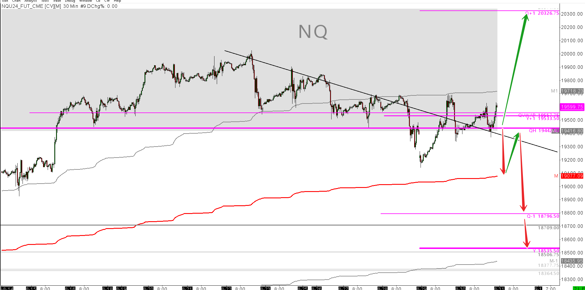 Watch out for only temporary buying at the M-VWAP, Let the market come down to lower/ deeper value Y-1 $18535 or if you want to be short, look for rejecting on a retest from below of the M-PVAL confluent with Q-PVAH $19442.5