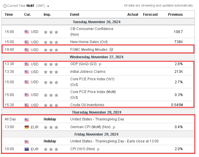 Good short and tidy week next week with highlights Tuesday evening and Wednesday being the focus. Thursday and Friday will be dull with the US Thanksgiving market holiday.