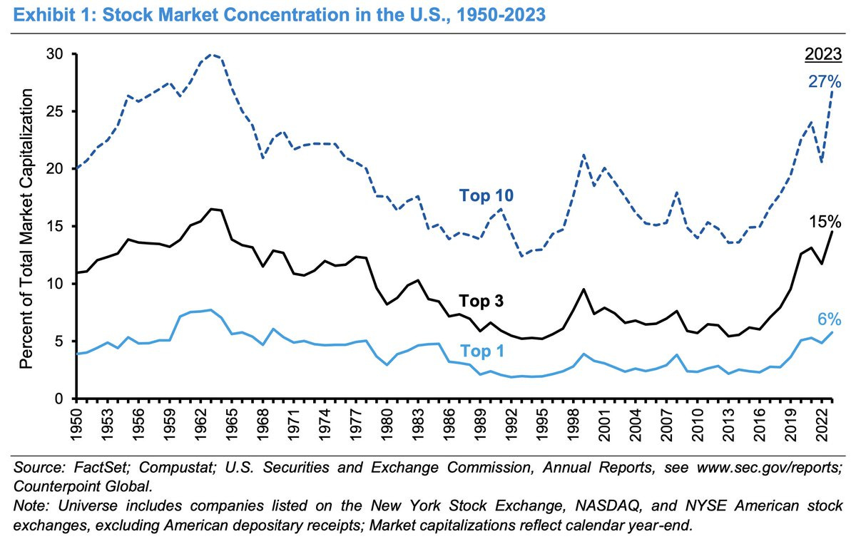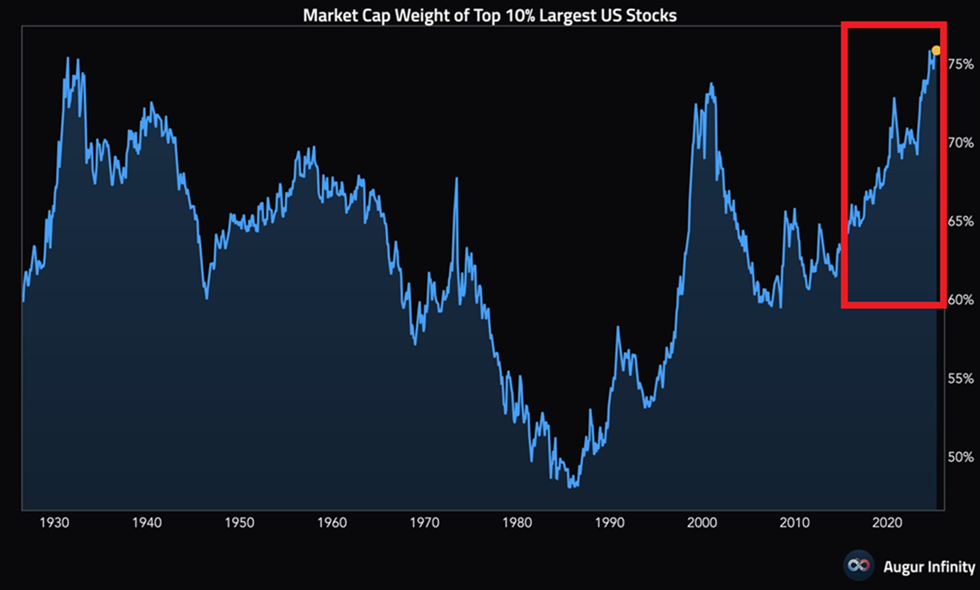 The S&P500 IS The Mag 7. And when we are in an A.I. golden bubble, the rally is justified. The top 10 stocks account for 76% of the market weight, i.e the total market’s value - the highest level ever recorded.