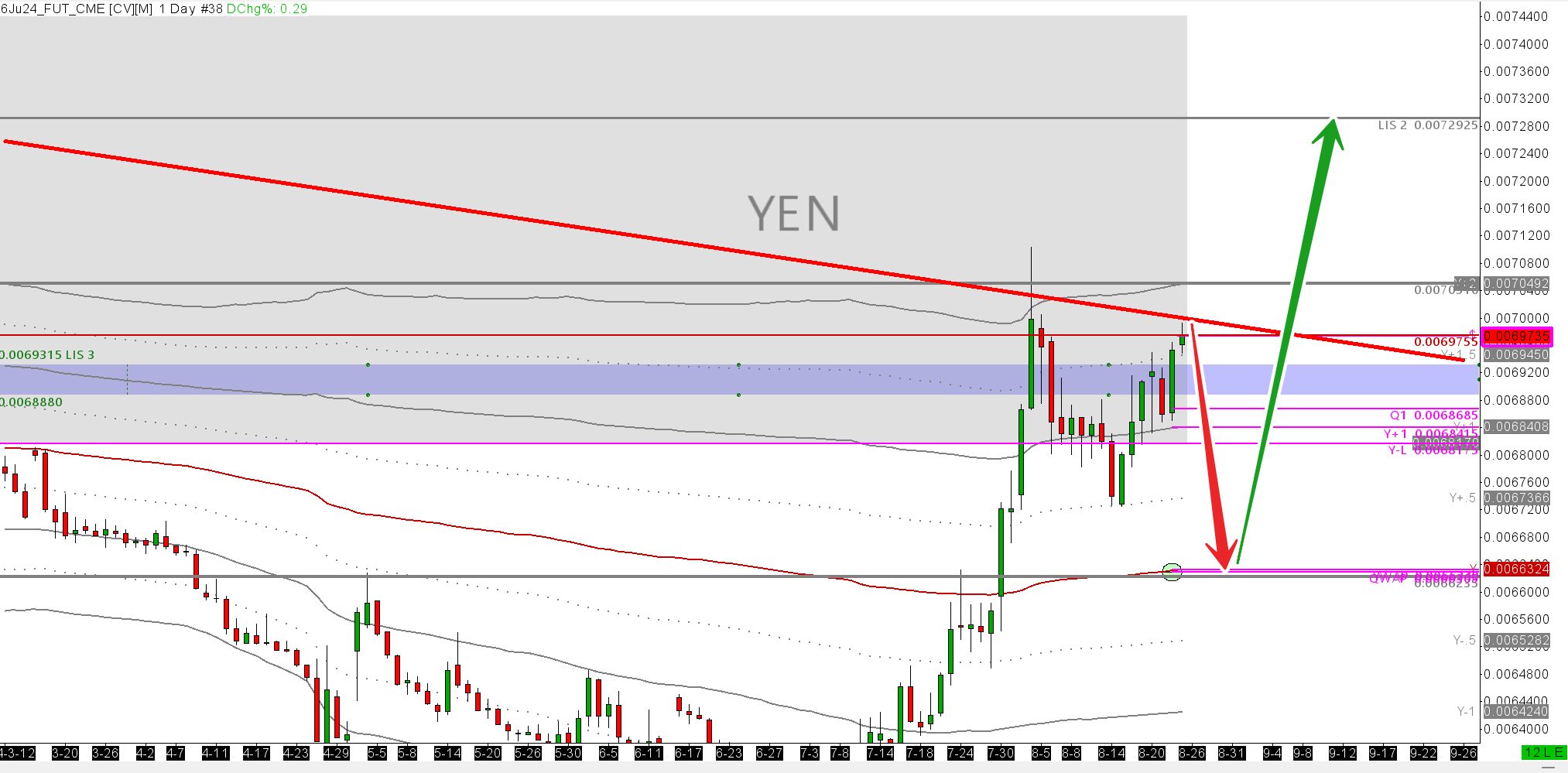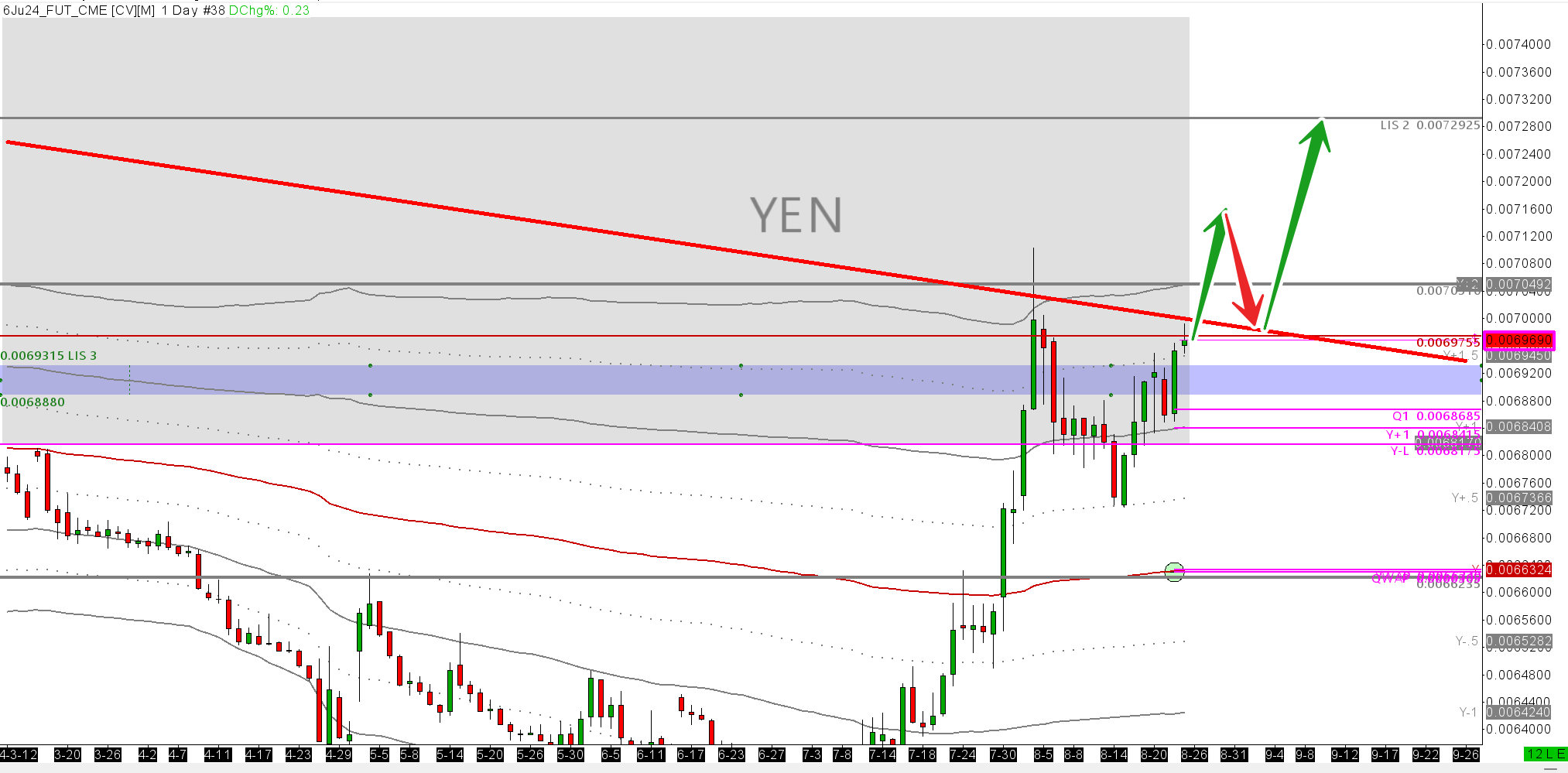 The bullish case: We have held onto the Y+1 for 4 of the last 5 trading sessions. This to me says imbalance up is holding. If this was a 30 min chart, I would buy the y+1 on re-tests, stopping out just below. What can keep us elevated would be a weak DXY, or a hawkish sounding BOJ.
