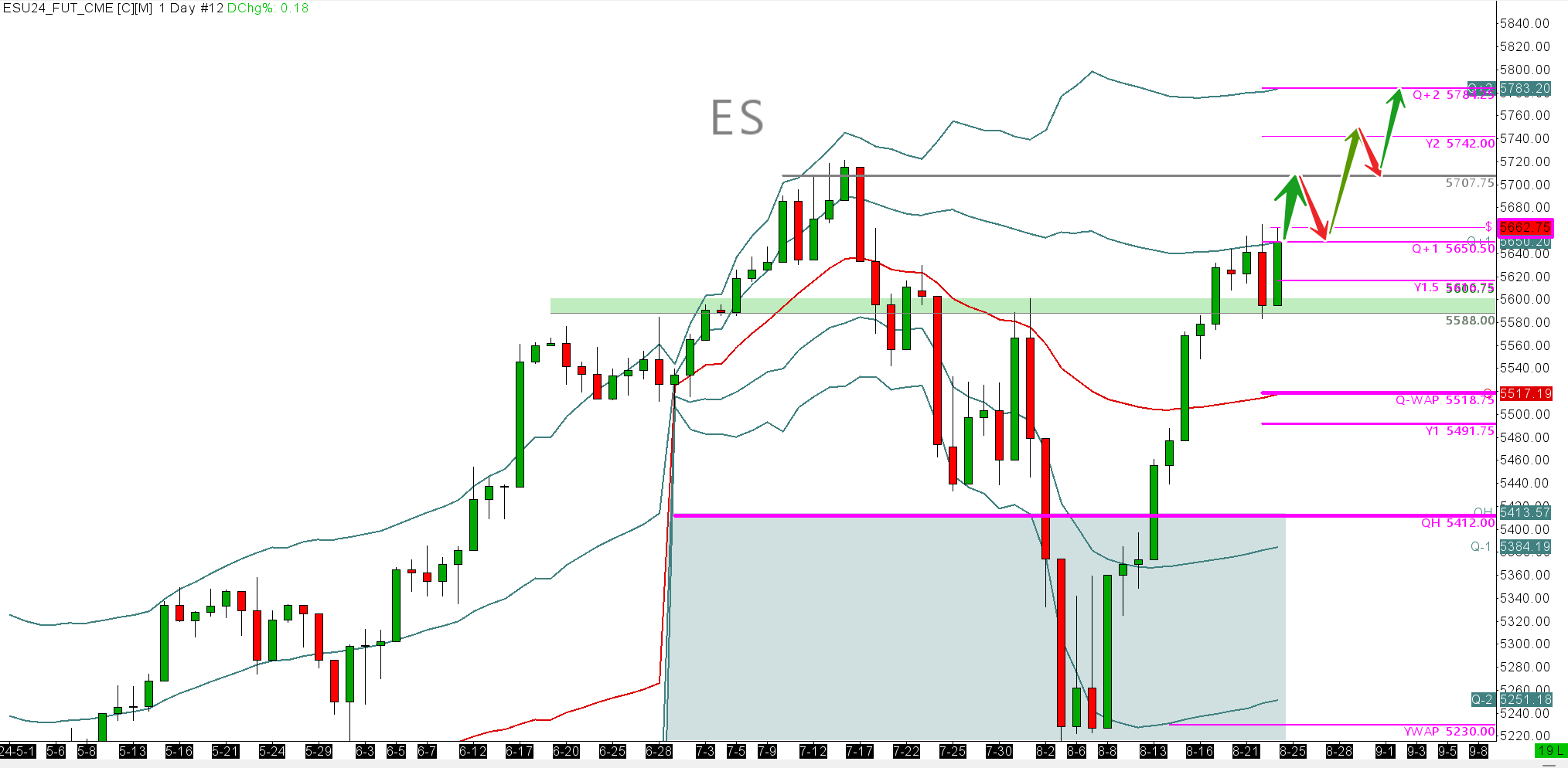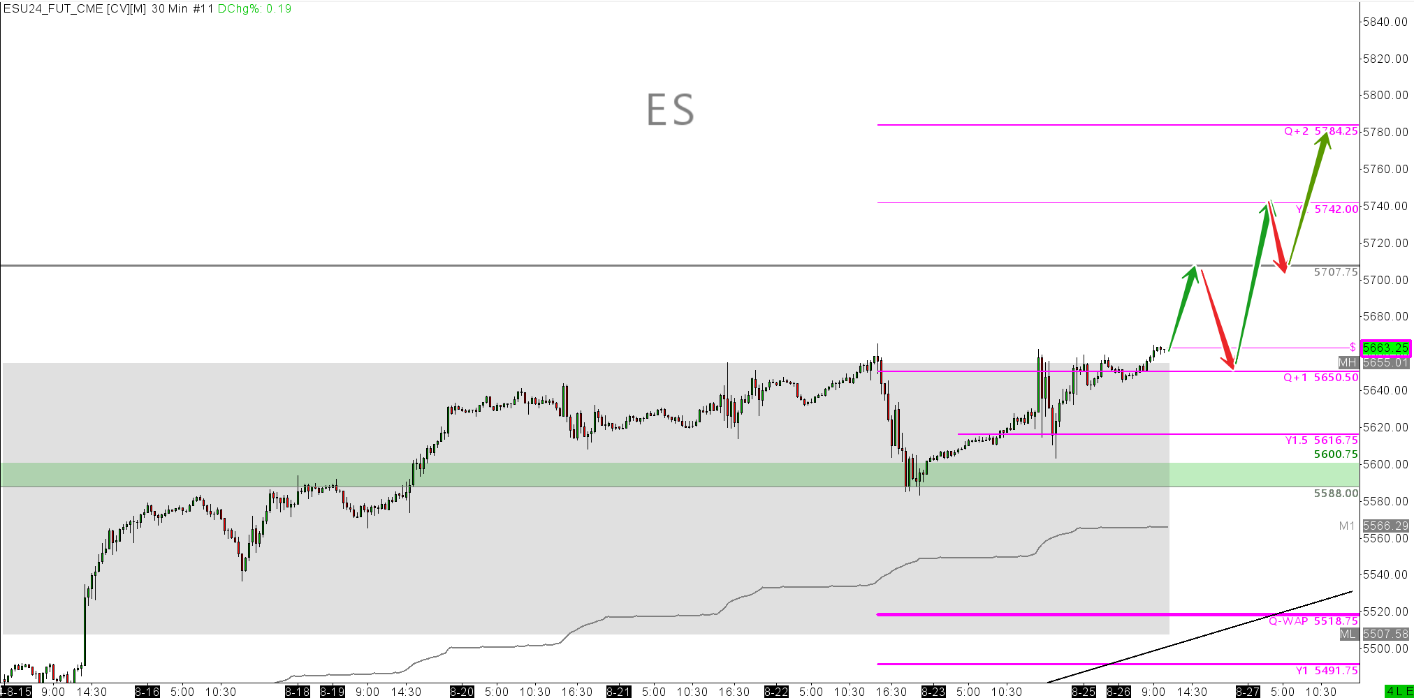 As mentioned above, we only have exogenous shocks that can hurt this market. Until we get to the FOMC 18th September, we can rally rally rally. That puts us on for $5707.75 resistance (high 12th July 2024) this week. GDP, PCE, come what may, any downside is protected for the time being). Factor in good NVIDIA earnings Wednesday, we could have a real party on our hands come the close Thursday. Trade on the long side. I will buy the deep intraday pullbacks at strong areas as per the 30min chart.