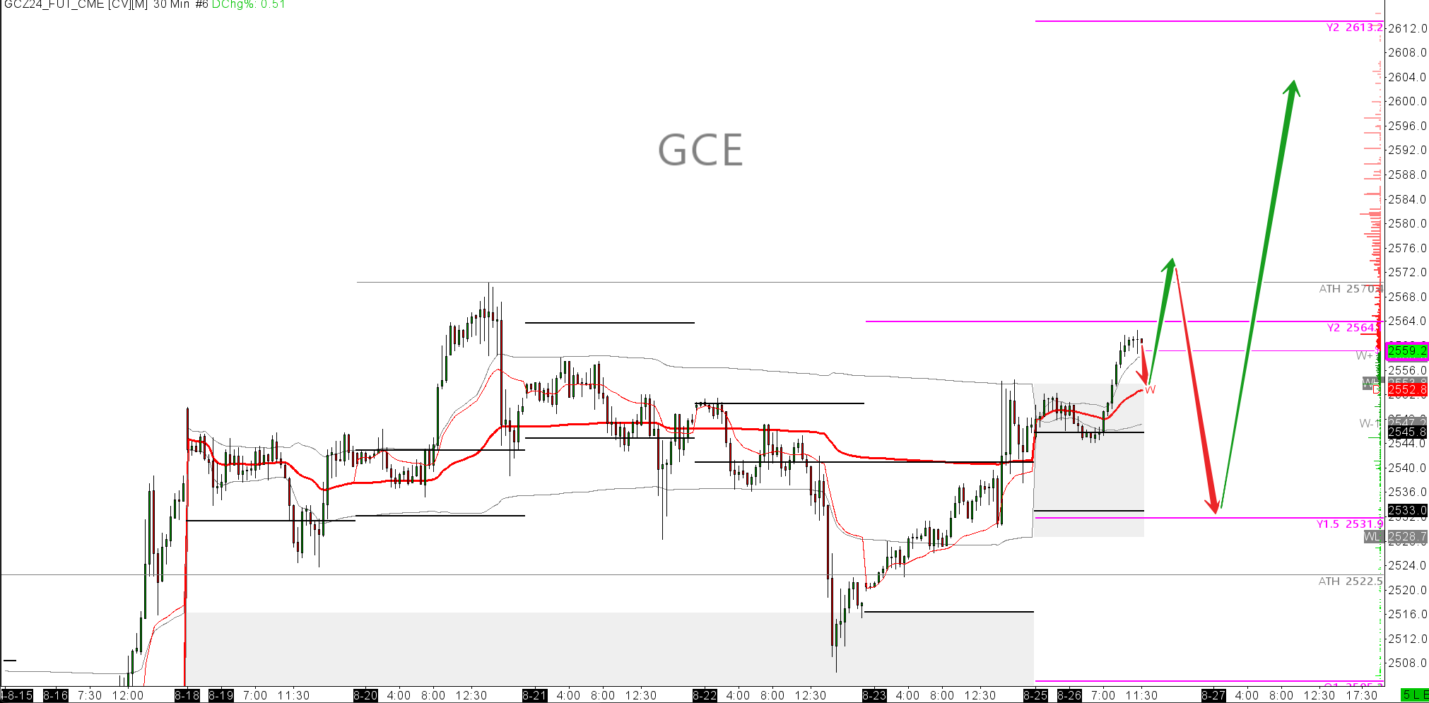 For trade this week, I see more strength and some nice areas to buy a pullback. I would rather get into gold trades either today-Monday, without the close overhang of GDP, or after we get GDP thursday. See the weekly vwap on the 30min below and how buying pullbacks here is good as long as it's above W-PVAH. Any buying below W-PVAH is compromised for tight risk trades. We would need to trade the Y+1.5 $2531 to see any strength of buying come in. Trade accordingly.