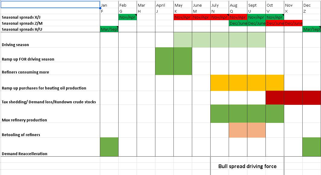However, it can be broken down in a much more simplistic way, as illustrated by the image below. There are over 35 different spreads that one can trade throughout the year to take advantage of the curve. Here are just a handful of the more commonly traded spreads.