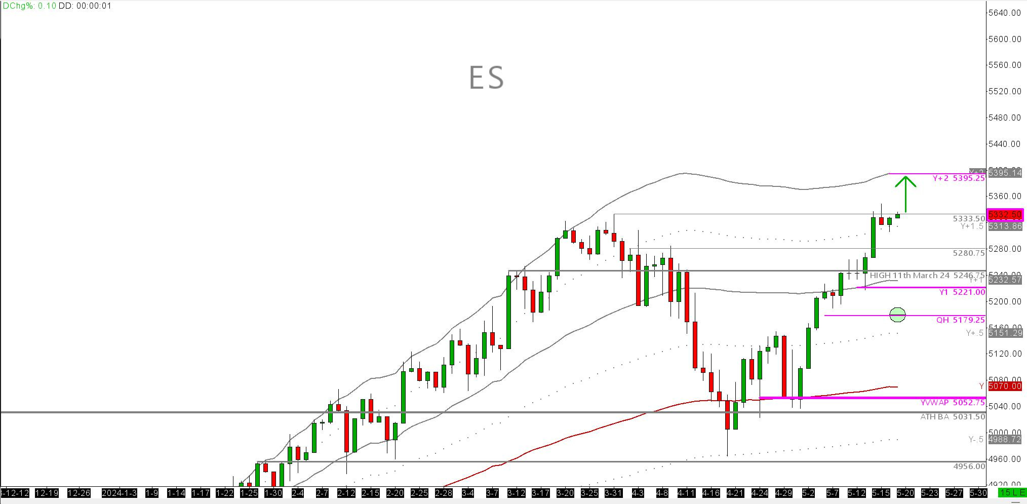 Let's be clear, my base case is higher and higher for US Equities, with yearly +2 deviations as the dynamic target to the upside before we have a calming pullback to reload for more buyers. So what is the other view? Well, NVIDIA could disappoint on earnings (though I doubt it will). This may result in some medium liquidation into the highs we are at. The market prices this rally on NVIDIA at $1400, Yet we are trading just below $1000. There's more room to run. Regarding ES, I see a short-term upside at $5395 and higher. I see support at the quarterly high pullback level of $5179.25. While I think the upper levels and continual new highs will print relatively quickly, it will take the market some time to pull back to the support at $5179.25.