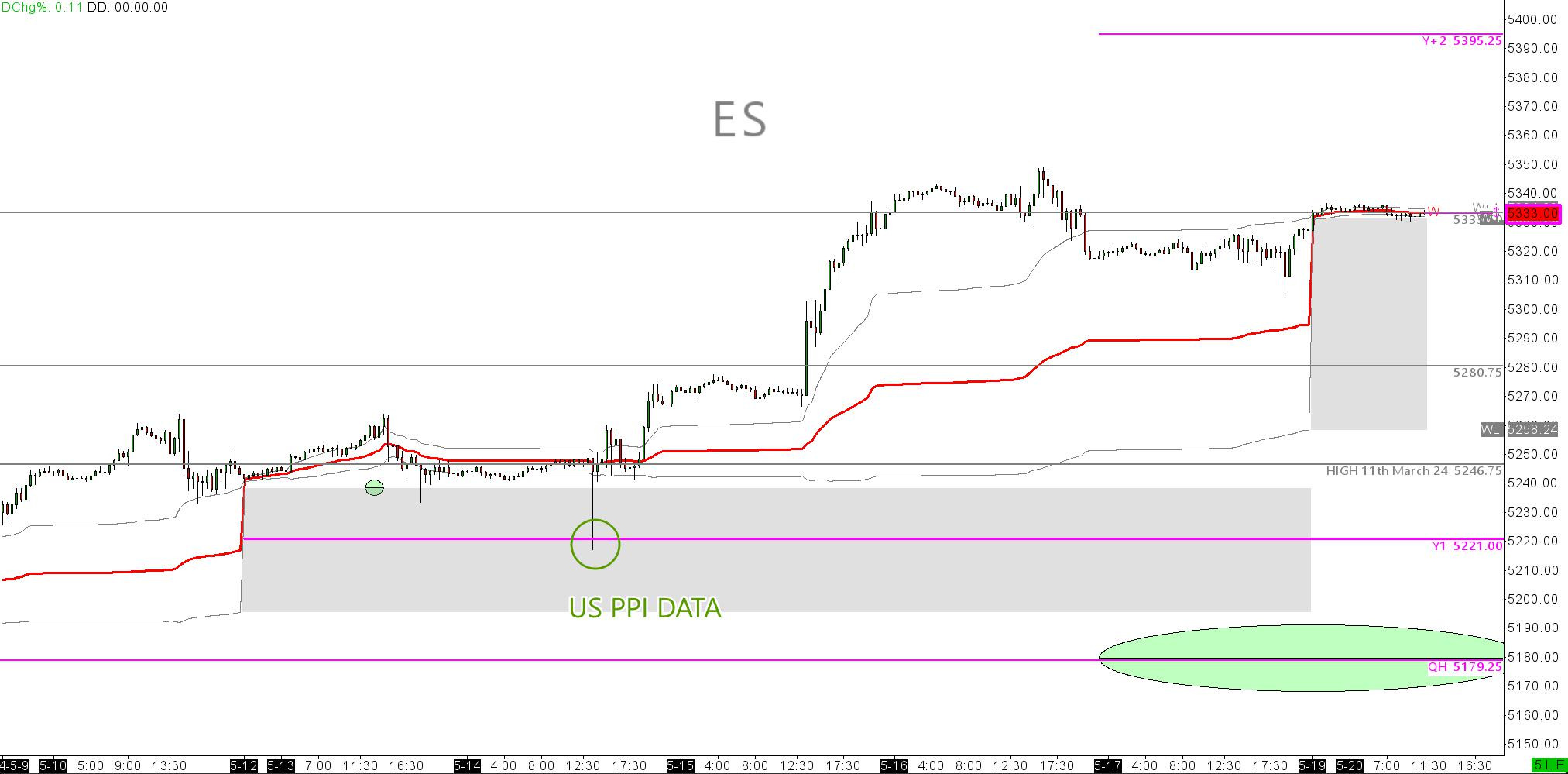 Last week on Tuesday, as discussed, the bulls came in. Bulls will bull! The PPI data came in hot with beats on headline and core. This feeds directly into a Fed cut scenario, and indeed we rallied. The great opportunity here was buying the Yearly +1 deviation on VWAP, which we executed in the Discord room trading live.