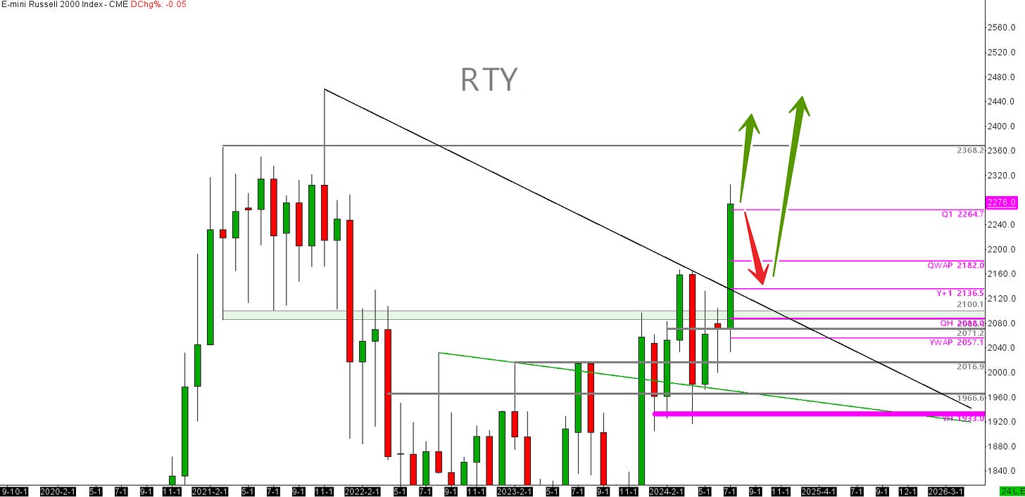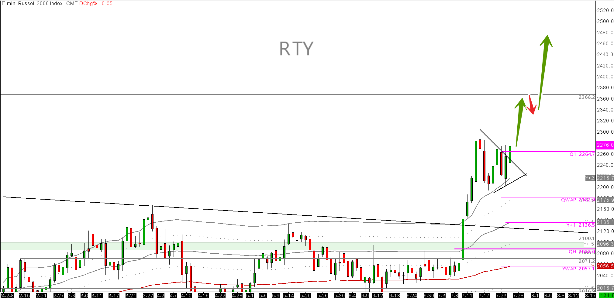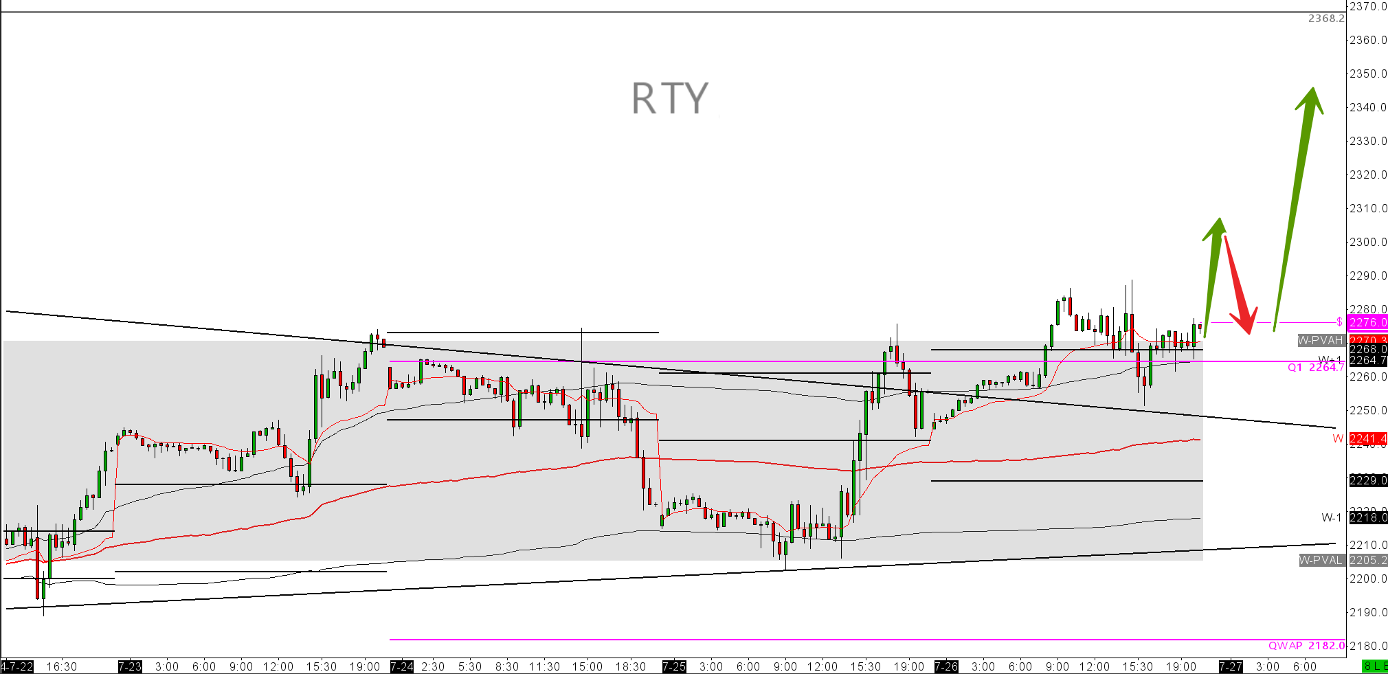The buying that came in on the monthly value low and how we sit poised above MPVAH $2270.6, ready to claim higher prices. Stay long RTY.