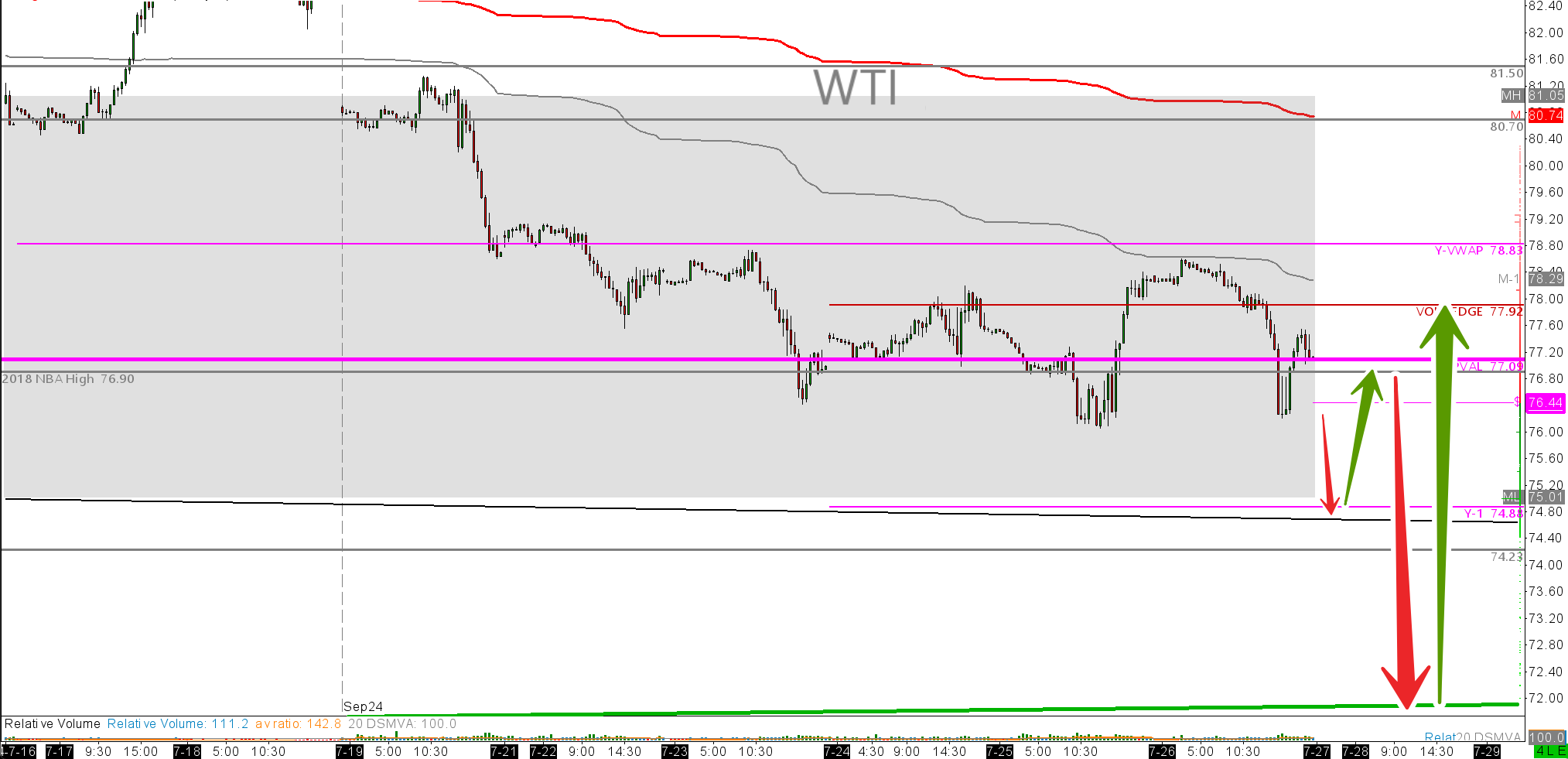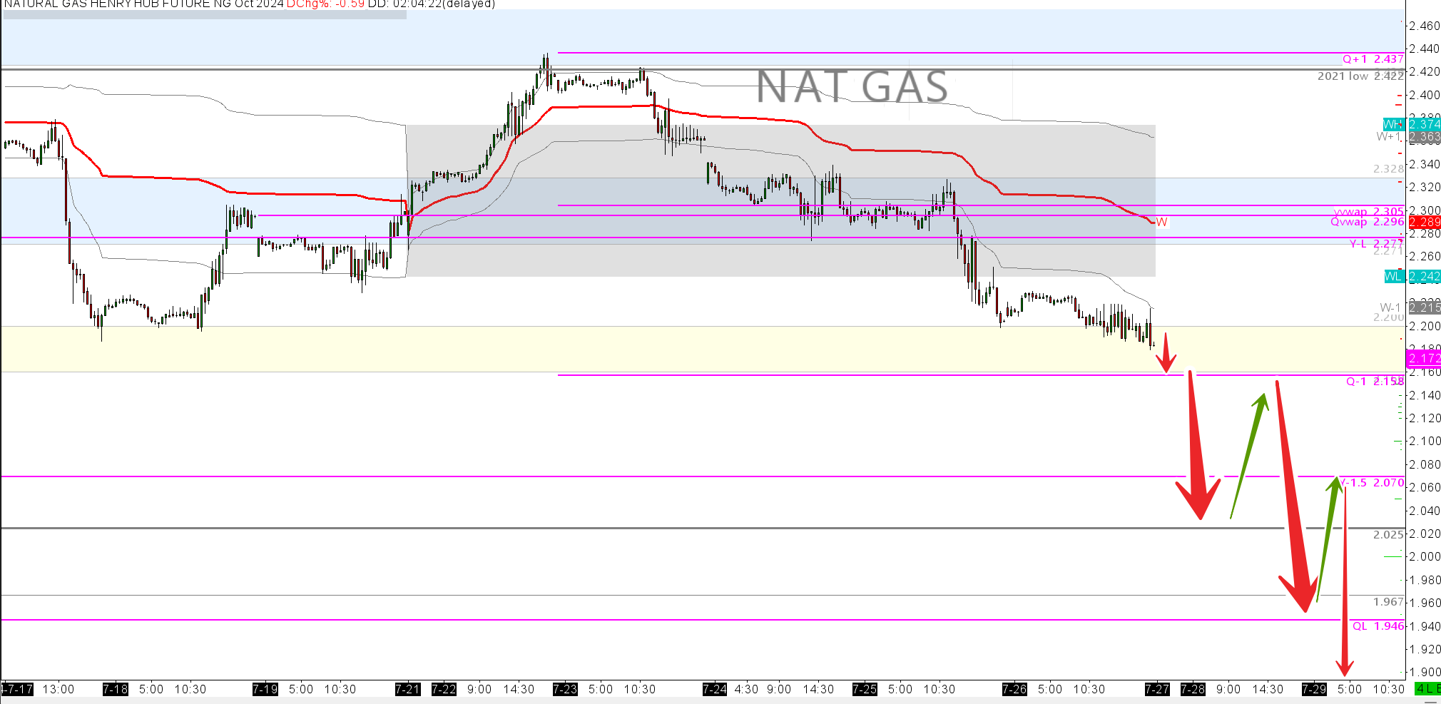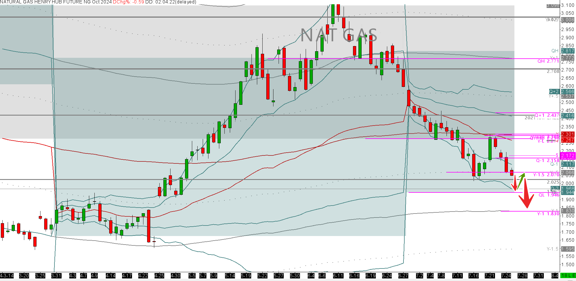 Shout out to the traders in my room that have been short NG for at the the last 30 days. Here is a simple one. I'm not going to claim any awards or stickers to say it, but NAT GAS, is balanced down ie. Trading down through the prior Q auction value area. We must trade the Q-PVAL $1.946. Check the balanced down on the daily bar chart with Q-VWAP on. The difference between balanced and imbalanced is: