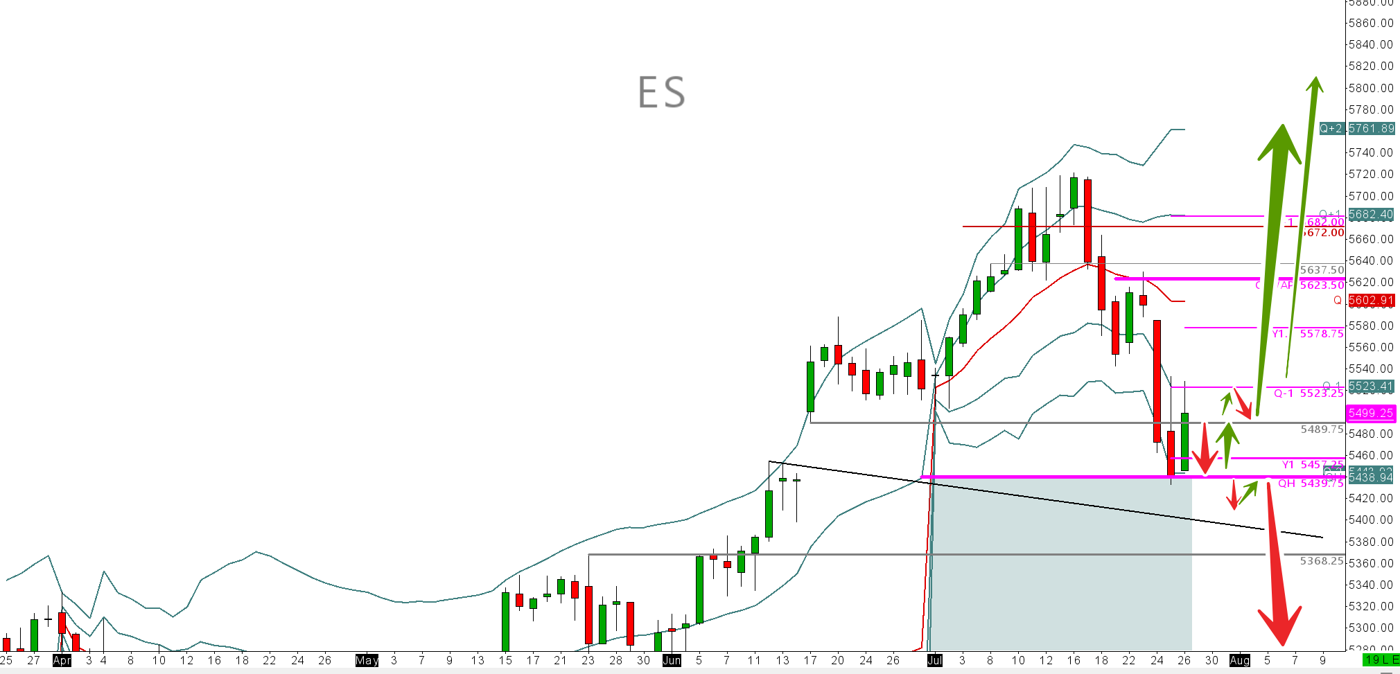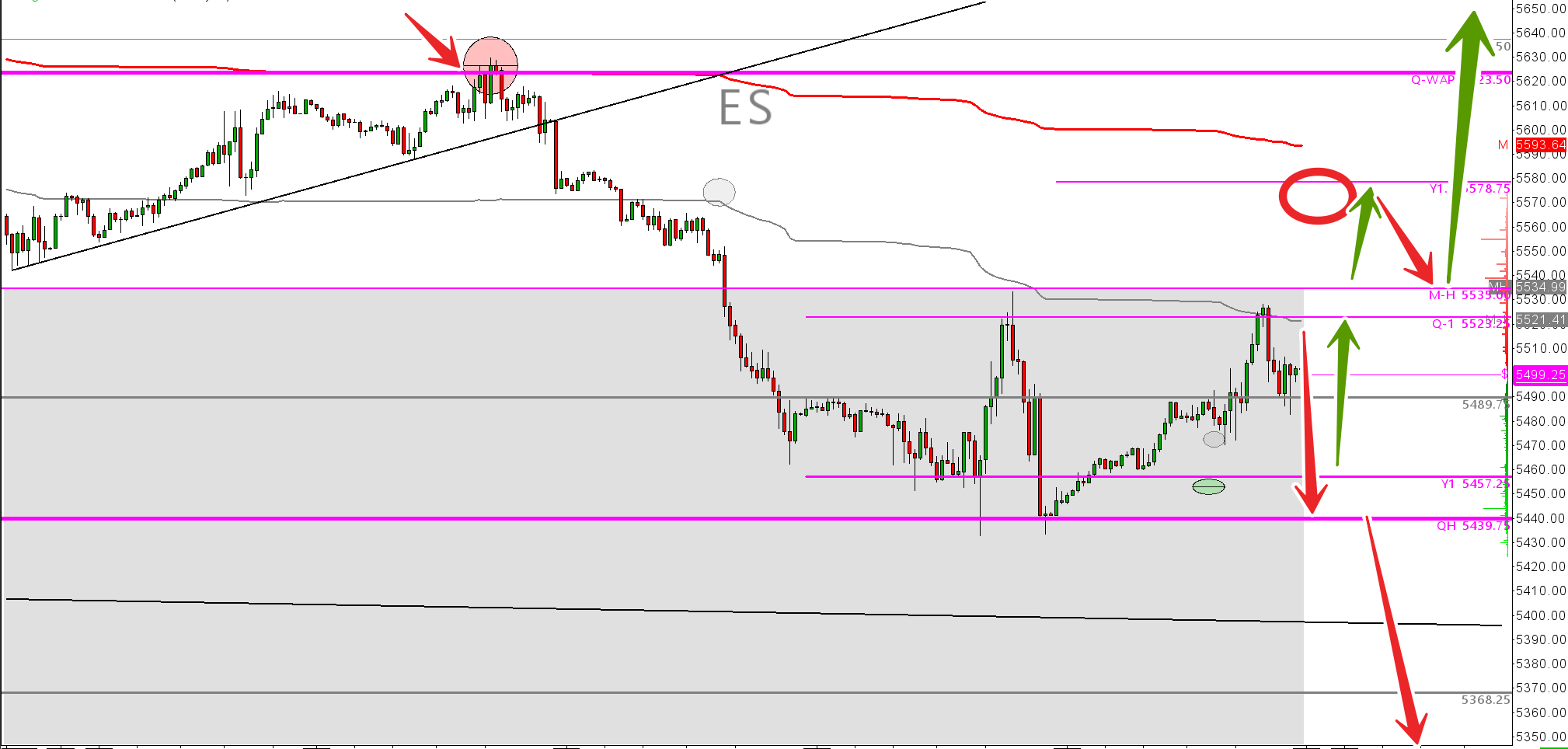 Due to the large selling down to Q-PVAH $5439 last week, then a neat turn around on a dime at that price, this week, I'm looking for that test of imbalance up to continue. I don't have to wait for any market events to tell me that average pricing is incredibly imbalanced up. Since we just got a check -go- continue at Q-PVAH, I think the market will rally no matter what from last weeks lows- as foreseen last week. A failure of this to happen is too big of a deal to simply shrug off. If we break down below Q-PVAH, This market is TOAST! But from my experience of trading HTF-Higher Time Frame VWAPS for 6 years, this tells me to be long long long until I get puked out of the turn about areas i.e.. Q-PVAH. $5439