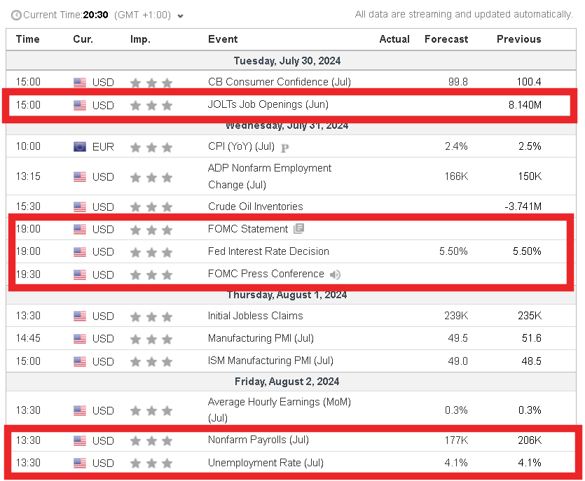 The highlight being the FOMC rate announcement on Wednesday followed by Fridays NFP Jobs report. For me, this FOMC is not the one. Don't get me wrong, there will be volatility, miss pricing and repricing risk and expectations. Market pricing is dead set on a September rate cut, which is my mind is not going to happen.Don't get stuck fighting tight ranges Monday and Tuesday and Wednesday pre FOMC in equities and FX.