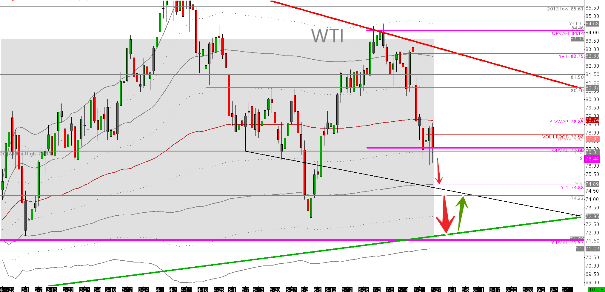 The current woes for oil are myriad. China closing down imports is nothing to overlook and indeed for the last 2 weeks-2x reports, that it exactly what we have been looking to drive market pricing down. We got it. For me, now the next legs is.......more down. On Tue, Wed, Thurs, Friday, we probed below Q-PVAH $77.09 and all underneath Y-VWAP ie. Average pricing for 2024. This tells me all I need to know. So much trade below average price on the year= acceptance below= more down. I'm sticking my neck out here a good bit, but I am going with a market that closed the week BELOW Q-PVAH. We need not look further that Y-VWAP, however if you want more, please refer to the pennant on the year. Sell on the red line, buy on the green. If you wonder about the breakout direction on the pennant, its also down. Have a read on the pennant pattern 101 here. Not something I really trade, but chartists love it.